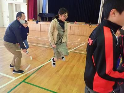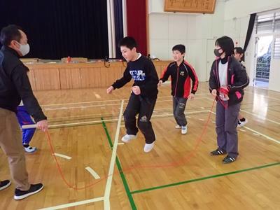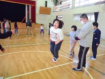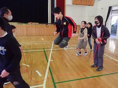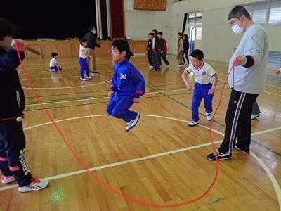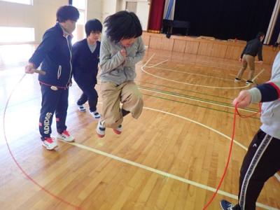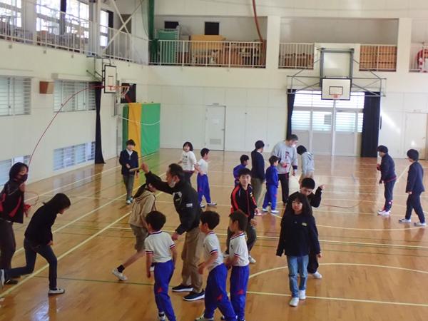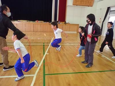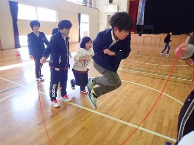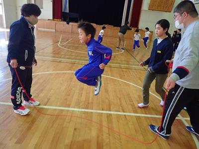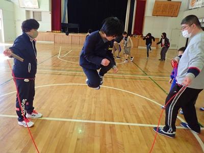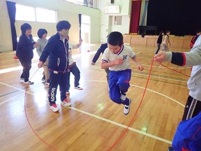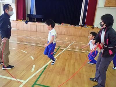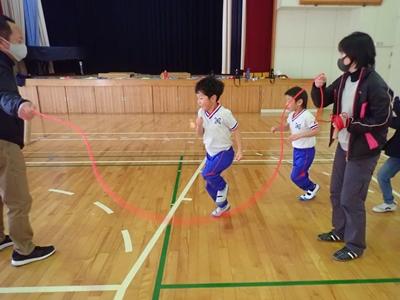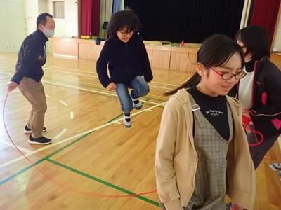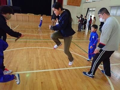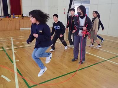 業間のチャレンジは今日も2チームに分かれて、8の字ジャンプです。1チーム目・・・