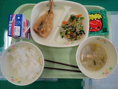 今日は節分なので、給食は節分メニューです。麦ごはん、イワシの梅フライ、小松菜のおひたし、白菜とお麩のみそ汁、福豆、牛乳です。