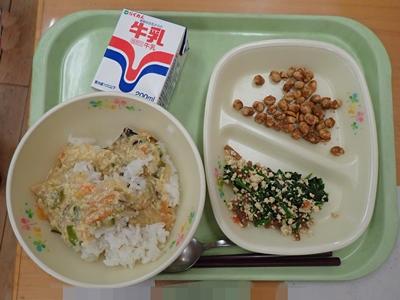 1月24日~30日は「全国学校給食週間」です。今日は最終日です。メニューは親子どんぶり(麦ごはん)、ほうれん草の白あえ、とうふ大豆きなこ、牛乳です。今日は「かみかみ献立」です。
