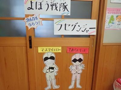 2021年1月25日 15時11分保健室前に『よぼう戦隊 フセグンジャー』の掲示があります。