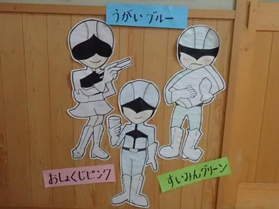保健室前に『よぼう戦隊 フセグンジャー』の掲示があります。