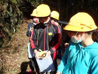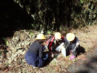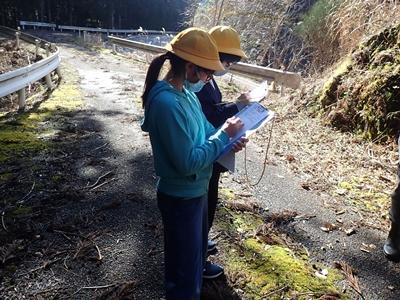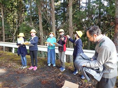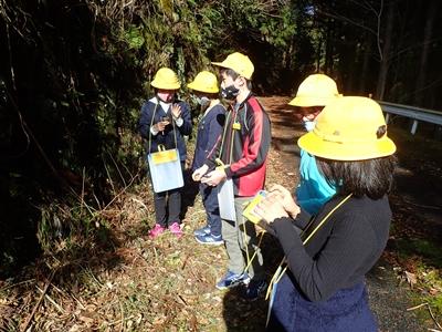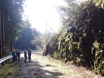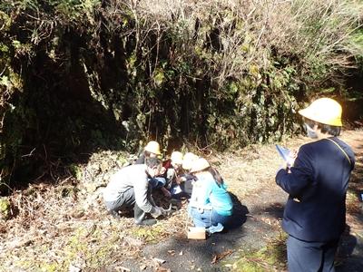暖かい日差しの中、6年生が理科の学習で地層の見学に出かけました。大川へ向かう道の旧道です。